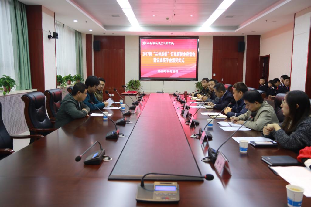10月25日,兰州市城市轨道交通有限公司与我院举办“兰州地铁”订单班校企座谈会暨企业奖学金颁奖仪式,兰州市城市轨道交通有限公司运营分公司人力资源部副部长李吉善一行三人,西安铁路职业技术学院党委副书记、纪委书记黄家昌,机电工程学院党总支书记张雅兰、院长代礼前和2017级“兰州地铁”订单班的40名师生参加会议。会议由西安铁路职业技术学院招生就业办公室副主任董奇主持。